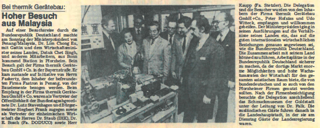 Auf einer Besuchsreise durch die Bundesrepublik Deutschland machte am Sonntag der Ministerpräsident von Penang/Malaysia, Dr. Lim Chong Eu, mit Gattin und dem Wirtschaftsminister seines Landes, Datuk Chet Singh, und anderen Mitarbeitern, aus Bonn kommend Station in Pforzheim. Sein Besuch galt der Firma thermik Gerätebau GmbH + Co. in der Bayernstraße. Er kam zustande auf Initiative von Herrn Faskerty, dem Inhaber der befreundeten Firma Fastron in Penang, von der Bauelemente bezogen werden. Beim Empfang in der Firma thermik Gerätebau GmbH + Co. waren als Vertreter der Öffentlichkeit der Bundestagsabgeordnete Dr. Lutz Stavenhagen und Bürgermeister Siegbert Frank zugegen sowie als Vertreter der einheimischen Wirtschaft die Herren Dr. Staub (IHK), Dr. E. Bosch (Fa. DODUCO) sowie Herr Kaupp (Fa. Stetzler). Die Delegation und die Besucher wurden von den Inhabern der Firma thermik Gerätebau GmbH + Co., Peter Hofsäss und Udo Witteck, empfangen und willkommen geheißen. Der Ministerpräsident ging in seinen Ausführungen auf die Verhältnisse seines Landes ein, das auf die guten internationalen wirtschaftlichen Beziehungen genauso angewiesen sei, wie die Bundesrepublik Deutschland. Die Zusammenarbeit mit seinem Land könne dazu führen, Arbeitsplätze in der Bundesrepublik Deutschland sicherer zu machen, da der dortige Markt enorme Möglichkeiten und hohe Wachstumsraten der Wirtschaft für den gesamten asiatischen Raum biete, die von bundesdeutschen und so auch von den Pforzheimer Firmen genutzt werden sollten. Nach der Firmenbesichtigung besuchte die Delegation anschließend des Schmuckmuseum der Goldstadt unter der Leitung von Dr. Falk. Die ausländischen Gäste fuhren danach in die Landeshauptstadt, in der sie am Dienstag Gäste der Landesregierung waren.