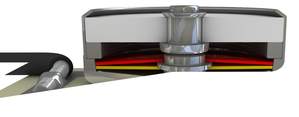 Le mécanisme de commutation de la gamme W1 est encastré par une forme adaptée et auto-alignement entre le fond d’un boîtier conducteur (1) et un couvercle CTP en titanate de baryum (2) qui est traversé par un contact argent fixe (6). Le disque ressort formant l’élément de transfert du courant (3) porte en même temps le contact mobile (4) et décharge le disque bilame (5) du passage de courant et de l’échauffement propre. Le disque bilame (5) est maintenu sur l’un de ces contacts mobiles traversants (4) sans devoir être fixé par soudure ou serrage. Il peut ainsi fonctionner librement en continu. Si la température de commutation nominale est atteinte, le disque bilame (5) s’enclenche dans sa position inversée et enfonce le disque ressort (3) vers le bas. Le contact s’ouvre brusquement et l’augmentation de température de l’appareil à protéger est interrompue. Grâce au semi-conducteur commuté en série, à base d’oxyde d’aluminium (7) avec résistance définie, le mécanisme de commutation est réchauffé depuis l’extérieur en fonction du courant de service et amené à l’ouverture. En outre, la résistance CTP commutée parallèlement développe maintenant une puissance de chauffe électrique définie sur le disque bilame (5) et le maintient durablement au-dessus de sa température de réenclenchement de sorte que le mécanisme de commutation ne puisse pas rétrograder. Le contact reste ouvert. Ce n’est qu’après suppression de la tension de service externe et/ou débranchement de l’appareil que le limiteur de température peut de nouveau se refroidir et commuter dans l’état de fermeture initial. Grâce à cette construction avec chauffage défini, il n’est plus nécessaire de coupler le limiteur de température à la source de chaleur potentielle de l’appareil à protéger. De tels limiteurs de température sont souvent utilisés de façon effective à d’autres endroits dans l’appareil à protéger.